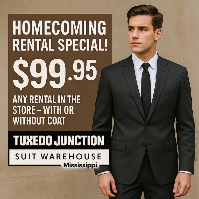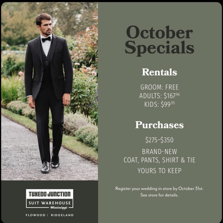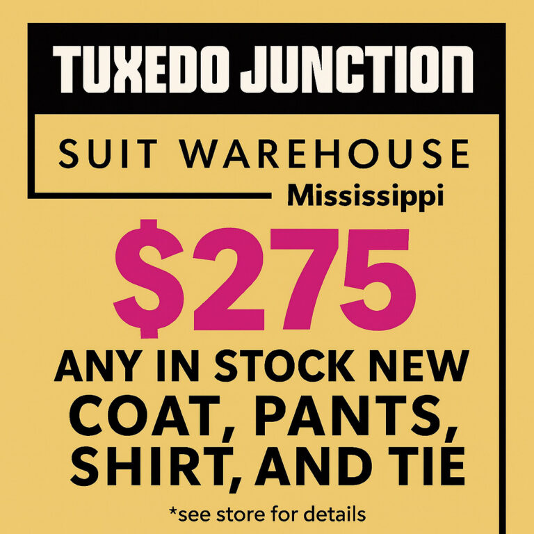 They have the largest in-store stock of tuxedos and suits in the state of Mississippi. Unlike their competition, they don’t ship all the tuxedos or suits in; therefore, they can exchange sizes and styles at the last minute. No need to worry about the out of town guy. When he arrives, if it doesn’t fit – another complete tuxedo or suit same day!